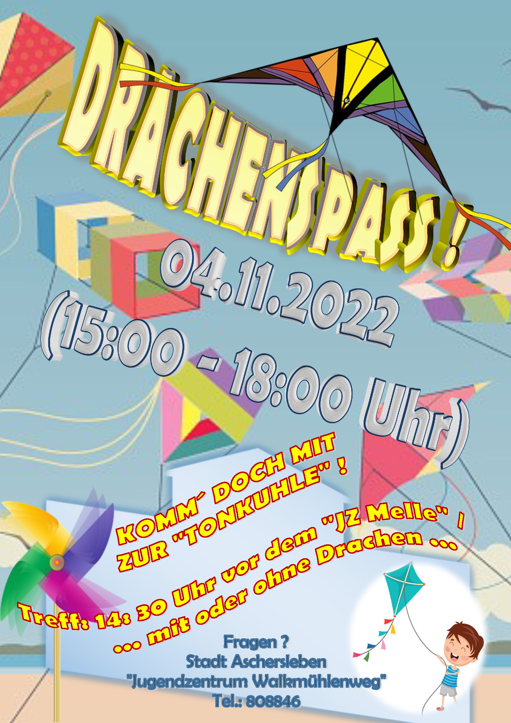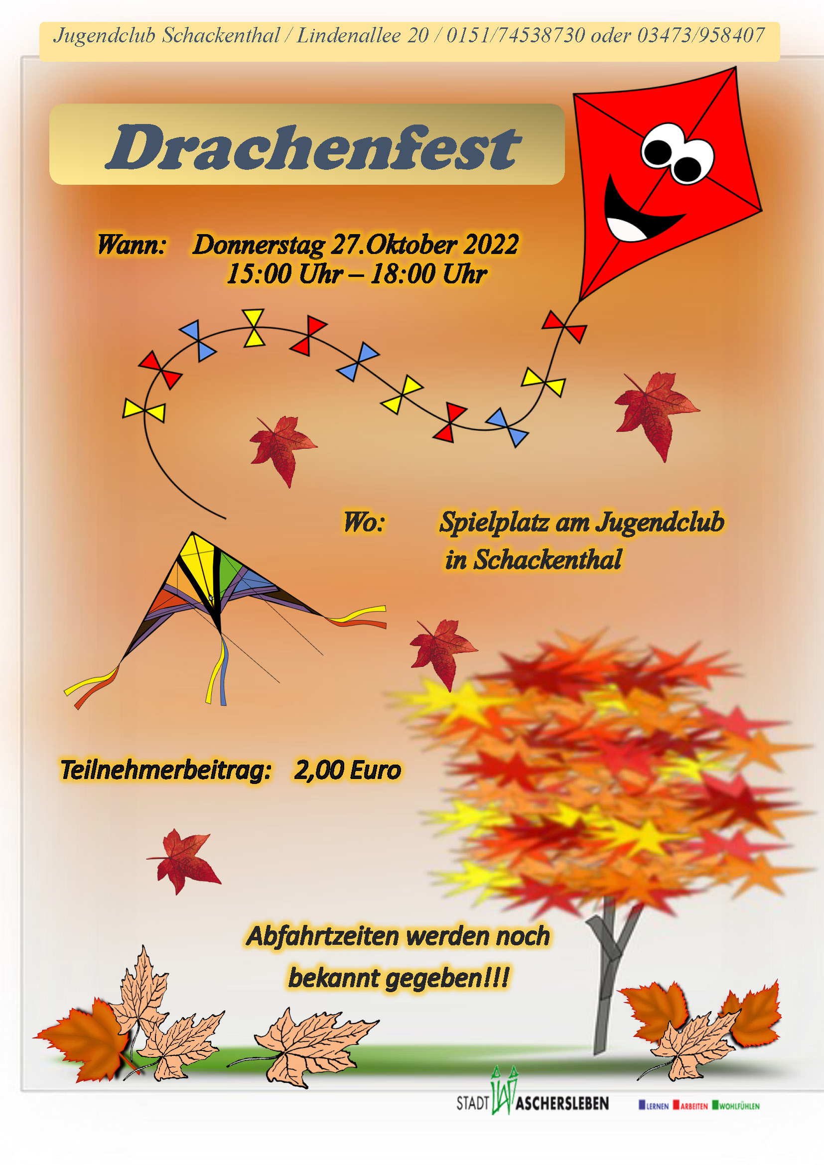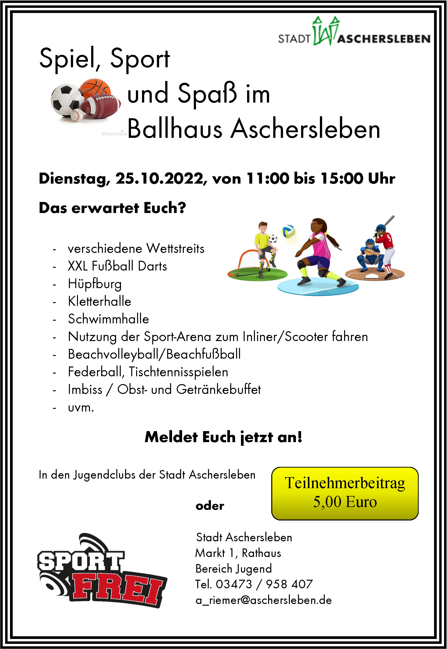 Weitere Information zu Veranstaltungen und Aktionen sowie die Anmeldungen erfolgen über die Jugendpflege der Stadt Aschersleben unter +49 3473 958 511 oder +49 3473 958407 sowie über die Jugendzentren und Jugendclubs der Stadt Aschersleben.