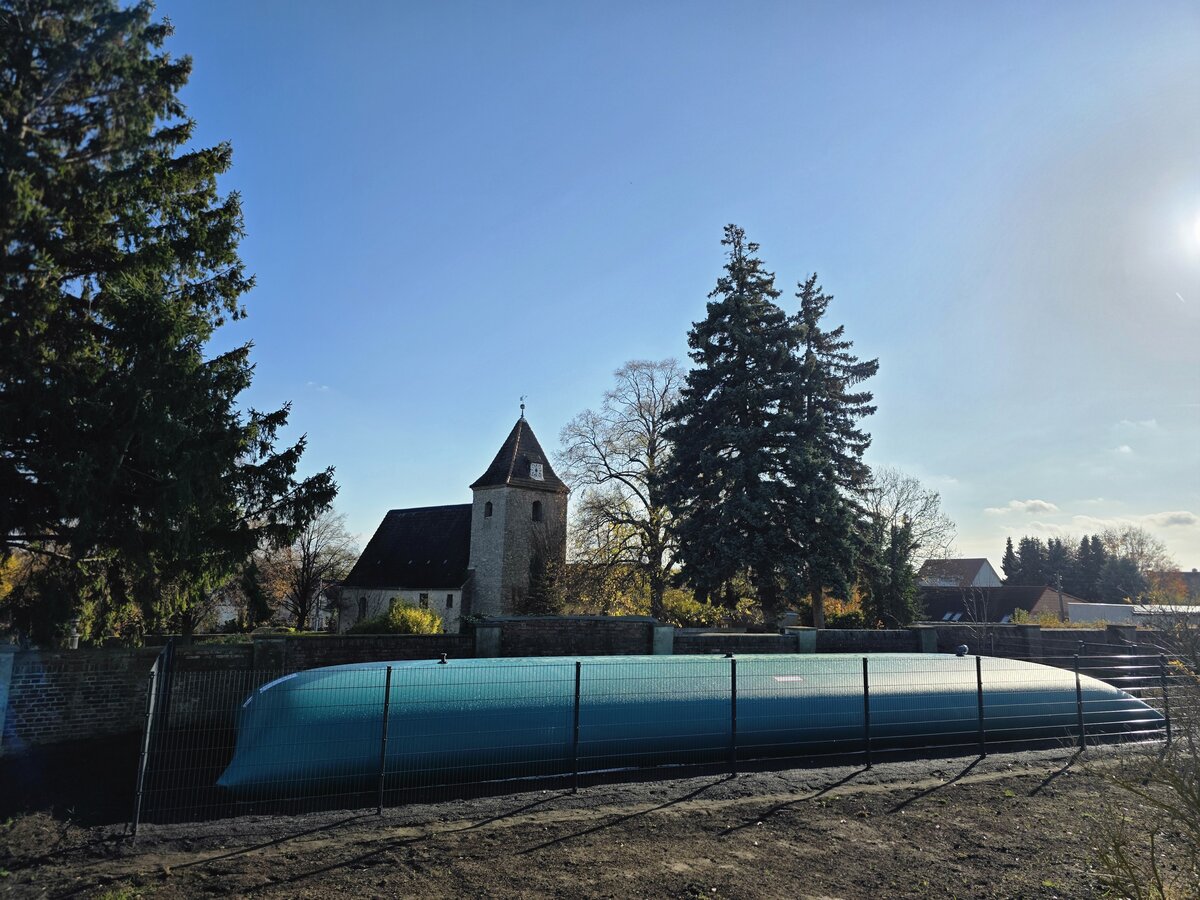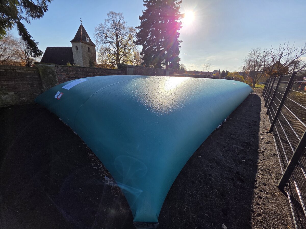 Ein Brand im Jahr 2023, bei dem zwei Wohnhäuser im Bereich des Landgrabens stark beschädigt worden sind, hat gezeigt, dass hier dringender Handlungsbedarf besteht. In enger und guter Abstimmung zwischen der Stadt Aschersleben und der MIDEWA als regionalem Wasserversorger wurde eine geeignete Lösung gefunden, um die gesetzlich vorgeschriebenen Kriterien zur Bereitstellung von Löschwasser zu erfüllen. Mit einer faltbaren Löschwasserzisterne gelang es, eine Verbesserung der Ausgangslage zu schaffen. Auf einem Teilgrundstück der Evangelischen Kirche in Mitteldeutschland, das die Stadt Aschersleben gepachtet hat, ist die Zisterne installiert worden.