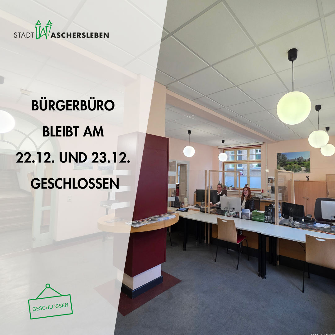 Das Bürgerbüro bleibt am 22.12. und 23.12.2025 aus personellen Gründen geschlossen. Die Fachbereiche sind zu den Sprechzeiten der Stadtverwaltung über den Eingang durch die grüne Tür erreichbar.