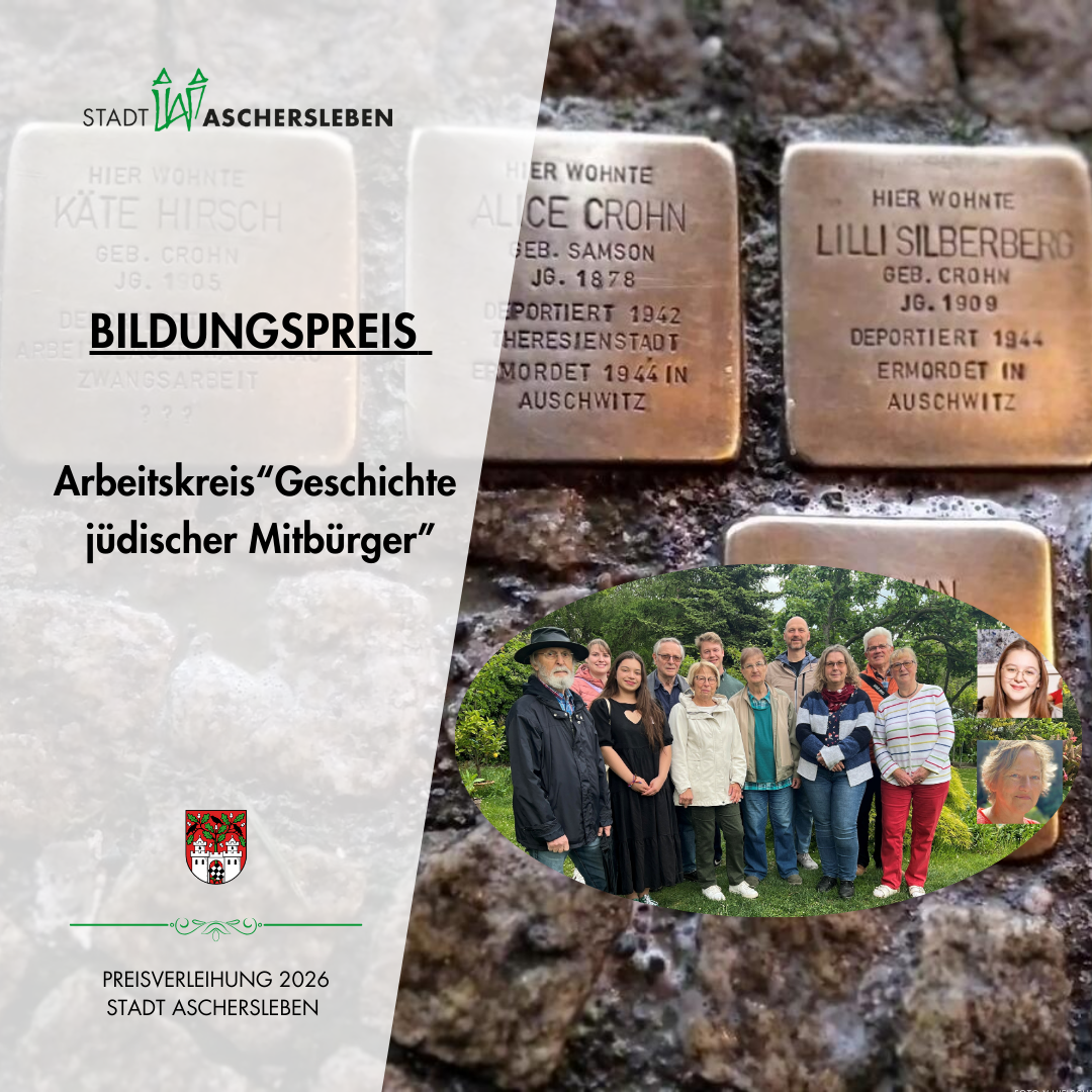 Mit dem Bildungspreis der Stadt Aschersleben werden innovative Bildungsmaßnahmen oder eine hervorragende Bildungsarbeit geehrt. In diesem Jahr wird der Arbeitskreis „Geschichte jüdischer Mitbürger in Aschersleben" mit dem Bildungspreis ausgezeichnet.
