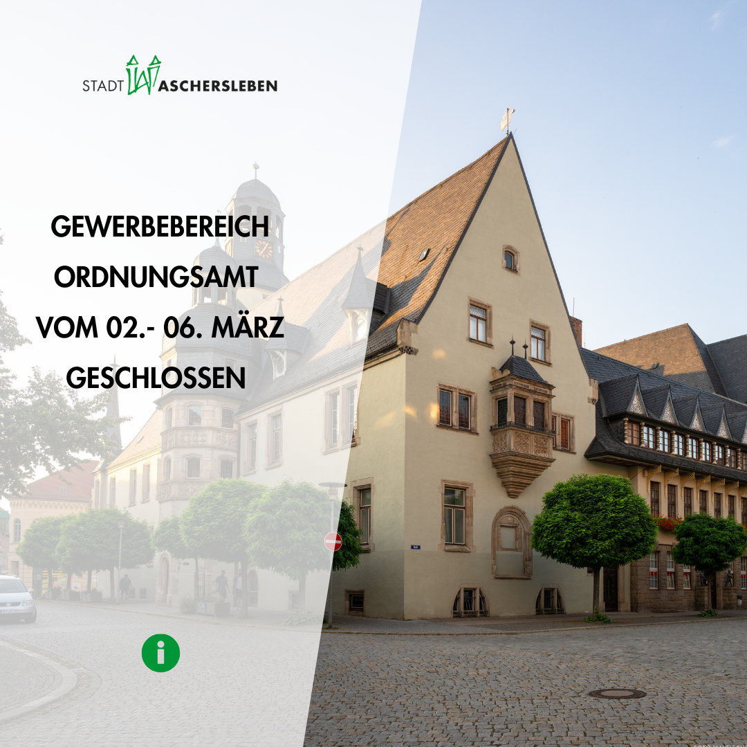 Der Bereich Gewerbeangelegenheiten im Ordnungsamt der Stadt Aschersleben wird im Zeitraum vom 02.03.-06.03.2026 aus personellen Gründen vorübergehend geschlossen. Anträge und Anfragen können während dieser Zeit aber weiterhin per Mail oder Brief eingereicht werden.