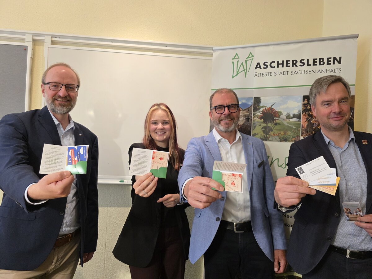 Um dieses Angebot zur Verfügung stellen zu können, unterstützt die Salzlandsparkasse die Willkommensgrüße als Sponsor. Nun steuert sie auch einen eigenen Gutschein für Kinder- und Jugendliche bei, der einlädt, ein Girokonto zu eröffnen. Als Anreiz gibt es dort gleich ein Startguthaben mit dazu. Im Beisein von Oberbürgermeister Steffen Amme sowie Hans-Michael Strube, Vorstandsvorsitzender der Salzlandsparkasse, und Virginia Marie Käding, Gruppenleiterin Service im Geschäftsstellengebiet Aschersleben, wurde der neue Gutschein im Pressegespräch der Stadt Aschersleben vorgestellt und wird ab sofort mit ausgeteilt.