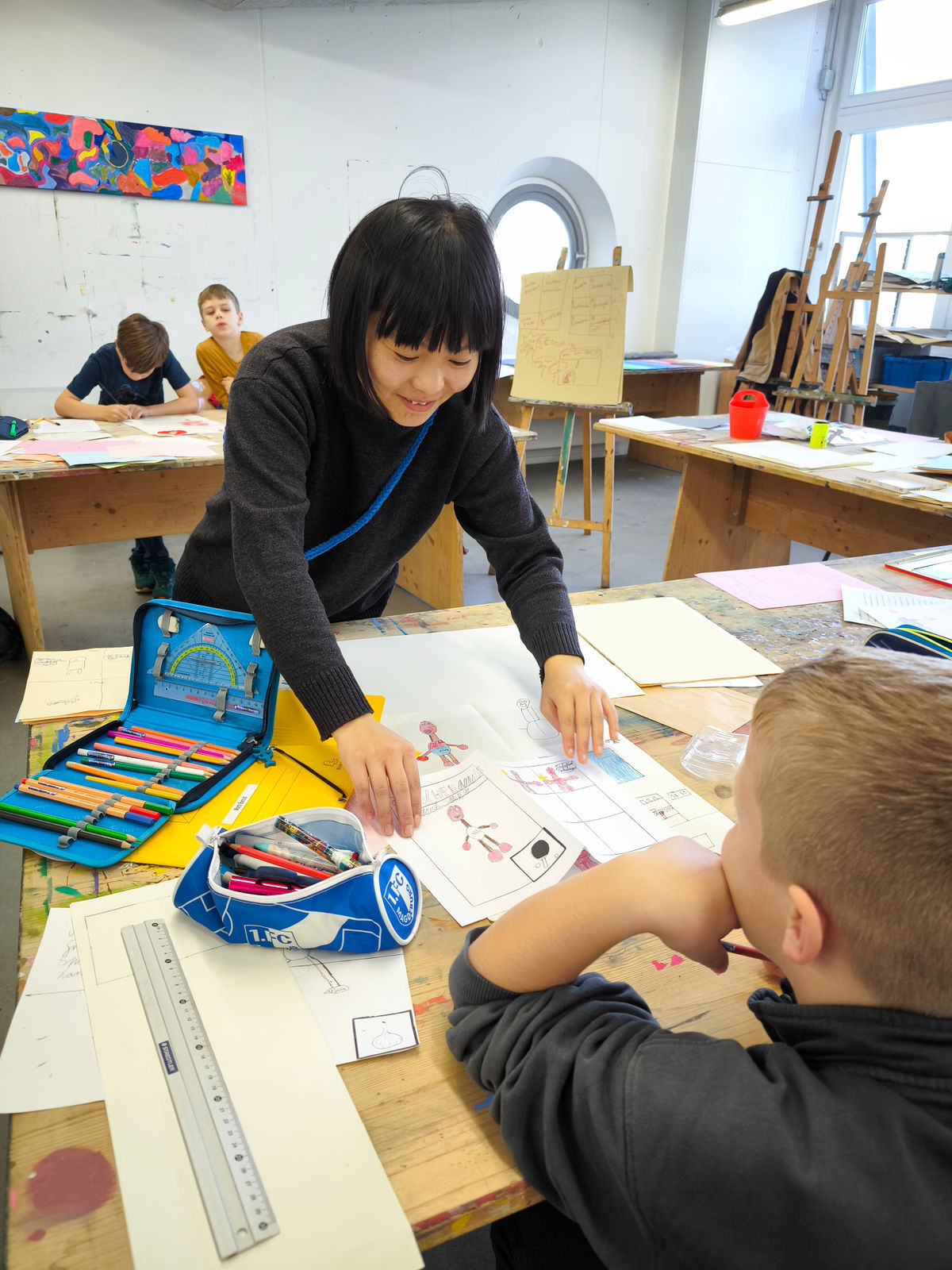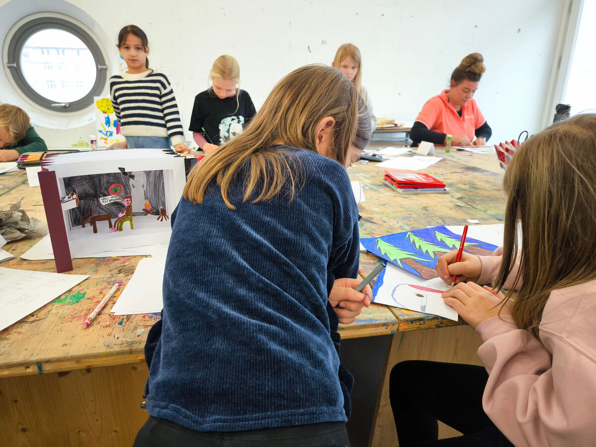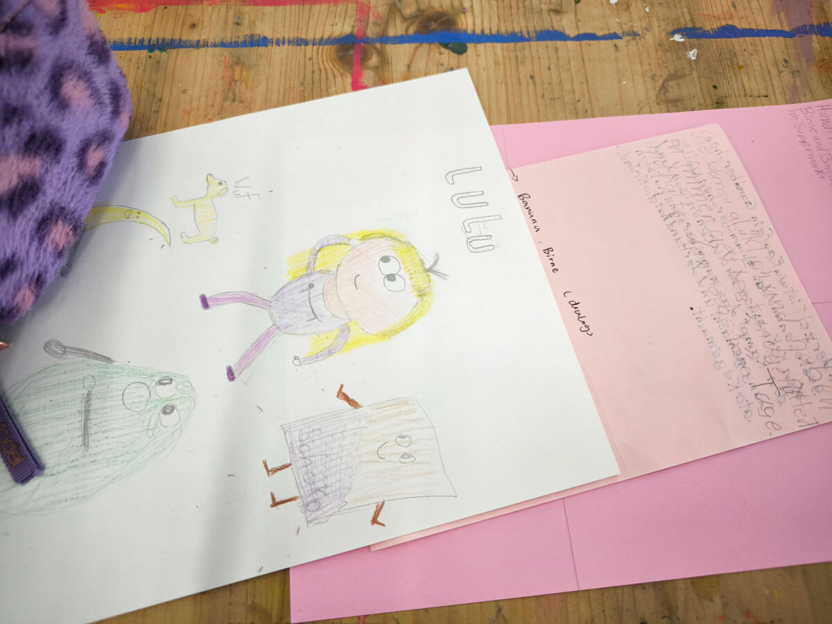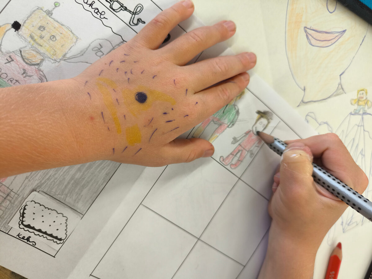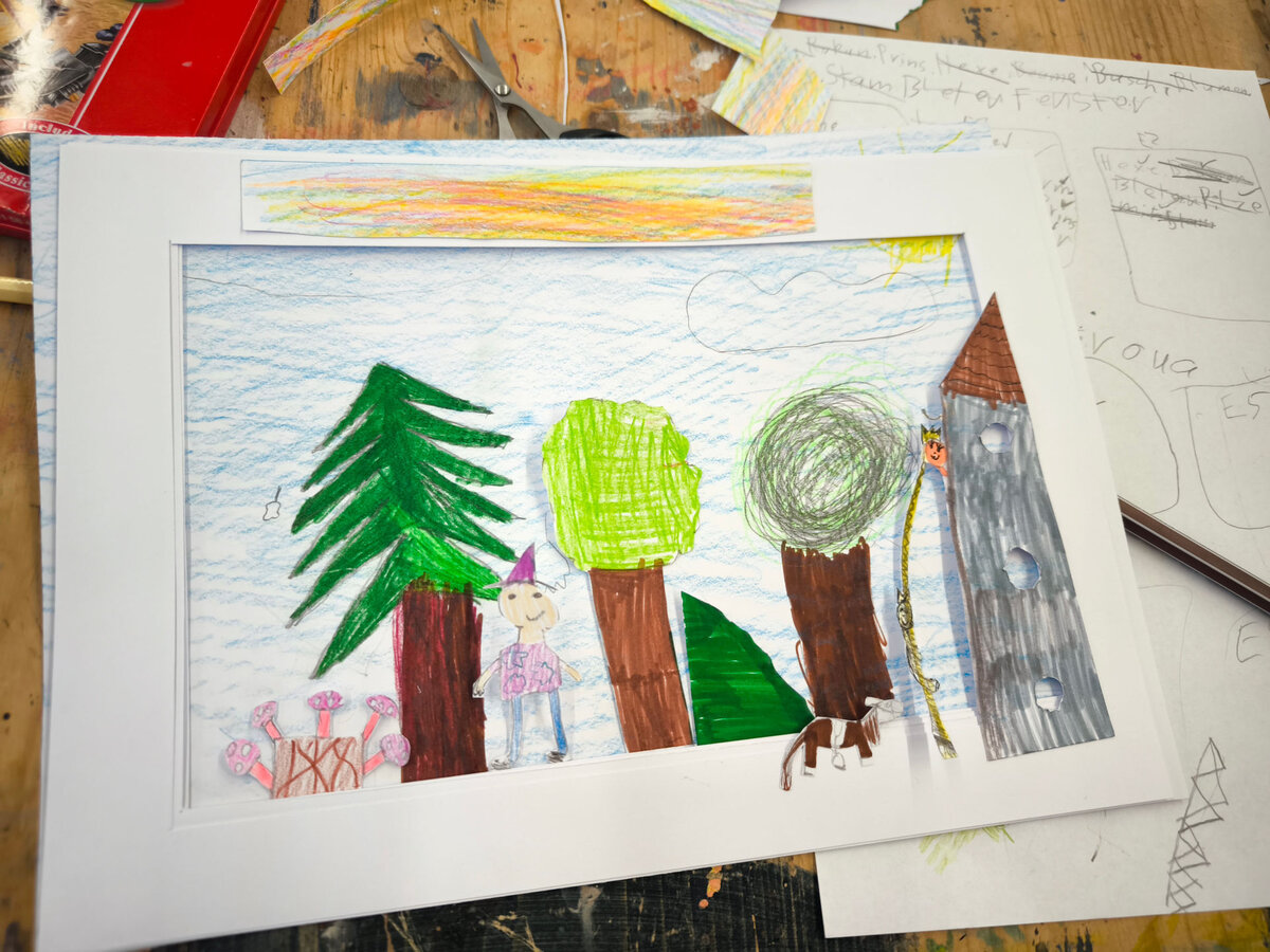 Auch die Ergebnisse aus der Werkstatt Illustration wurden ausgestellt. Die Kinder haben erklärt, welche Techniken sie verwendet haben.