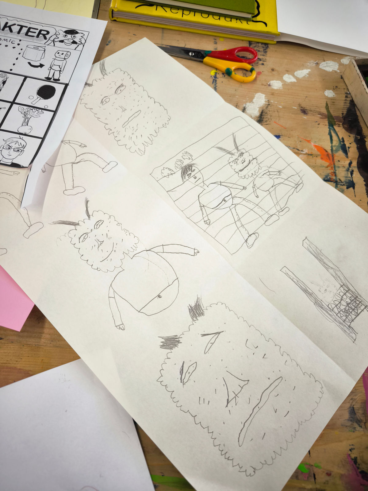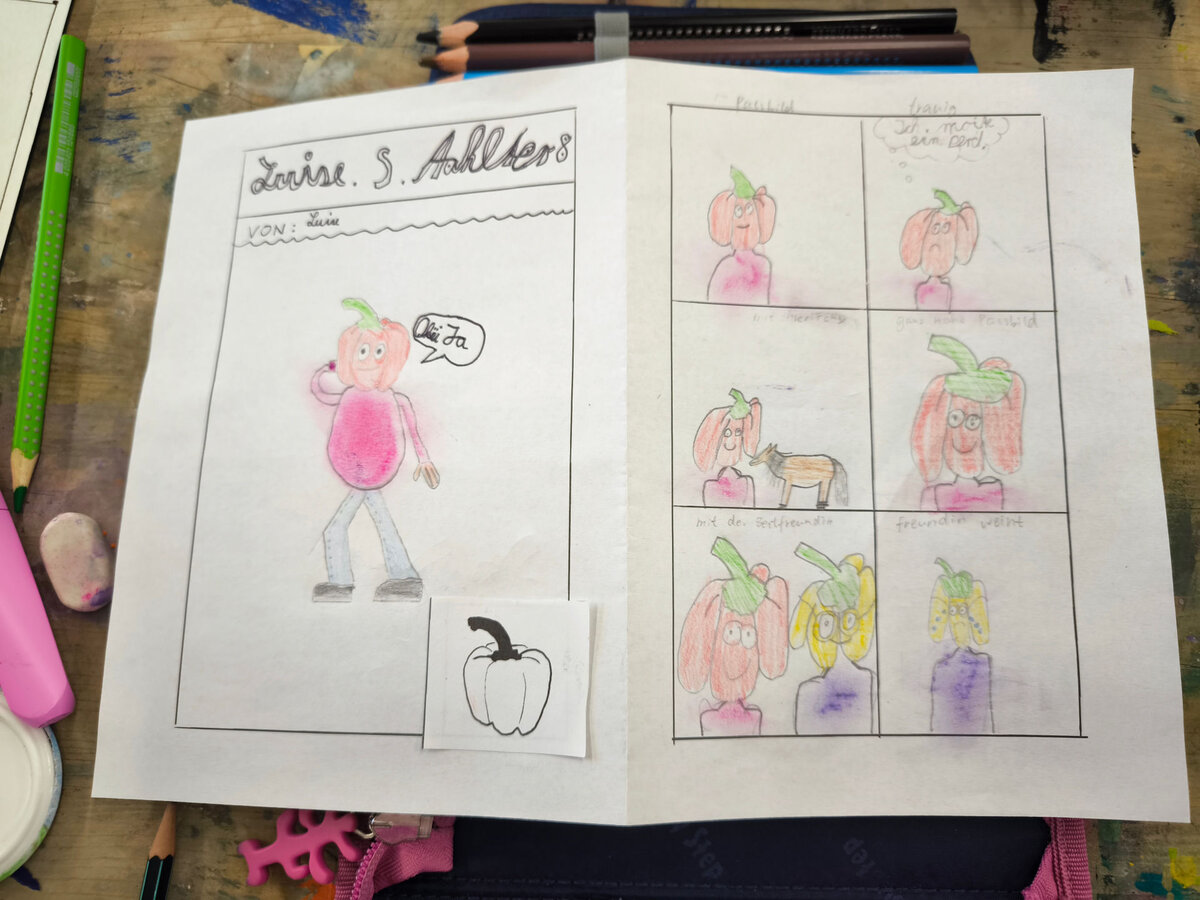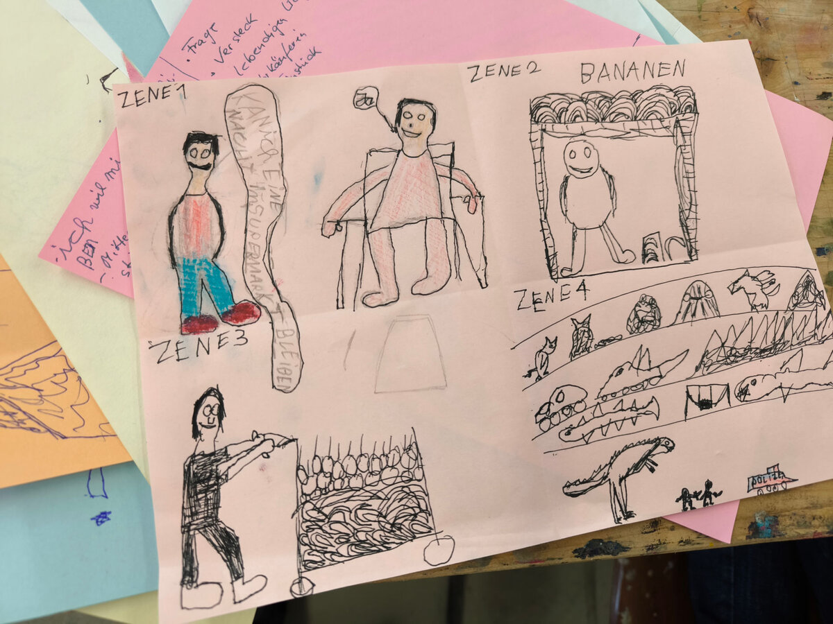 Aus der Projektbeschreibung: "Die Welt ist ein großer Supermarkt" - Gemeinsam entdecken wir Geschichten zwischen den Regalen. Hast du dich schon mal gefragt, was passieren würde, wenn du dich nach Ladenschluss in einem Supermarkt versteckst? Wusstest du, dass die Zitrone mit der Orange zusammen ist? Und warum will das Eis auf keinen Fall verkauft werden? In diesem Workshop tauchen wir ein in die fantastische Welt des Supermarkts. Gemeinsam erfinden wir Figuren, schreiben kleine Geschichten und entdecken, wie man mit Bildern erzählen kann. Vielleicht triffst du eine Sardinendose, die Model werden will – oder eine Cola, die auf der Suche nach ihrem Bruder ist! Du lernst: - Wie man Gegenständen Persönlichkeit verleiht - Wie man Geschichten mit Bildern erzählt - Wie du deine eigene Comic-Seite gestaltest Du musst nicht gut zeichnen können und brauchst keine perfekten Texte – Neugier und ein bisschen Fantasie reichen völlig aus. Mach mit und entdecke den Supermarkt von einer ganz anderen Seite.