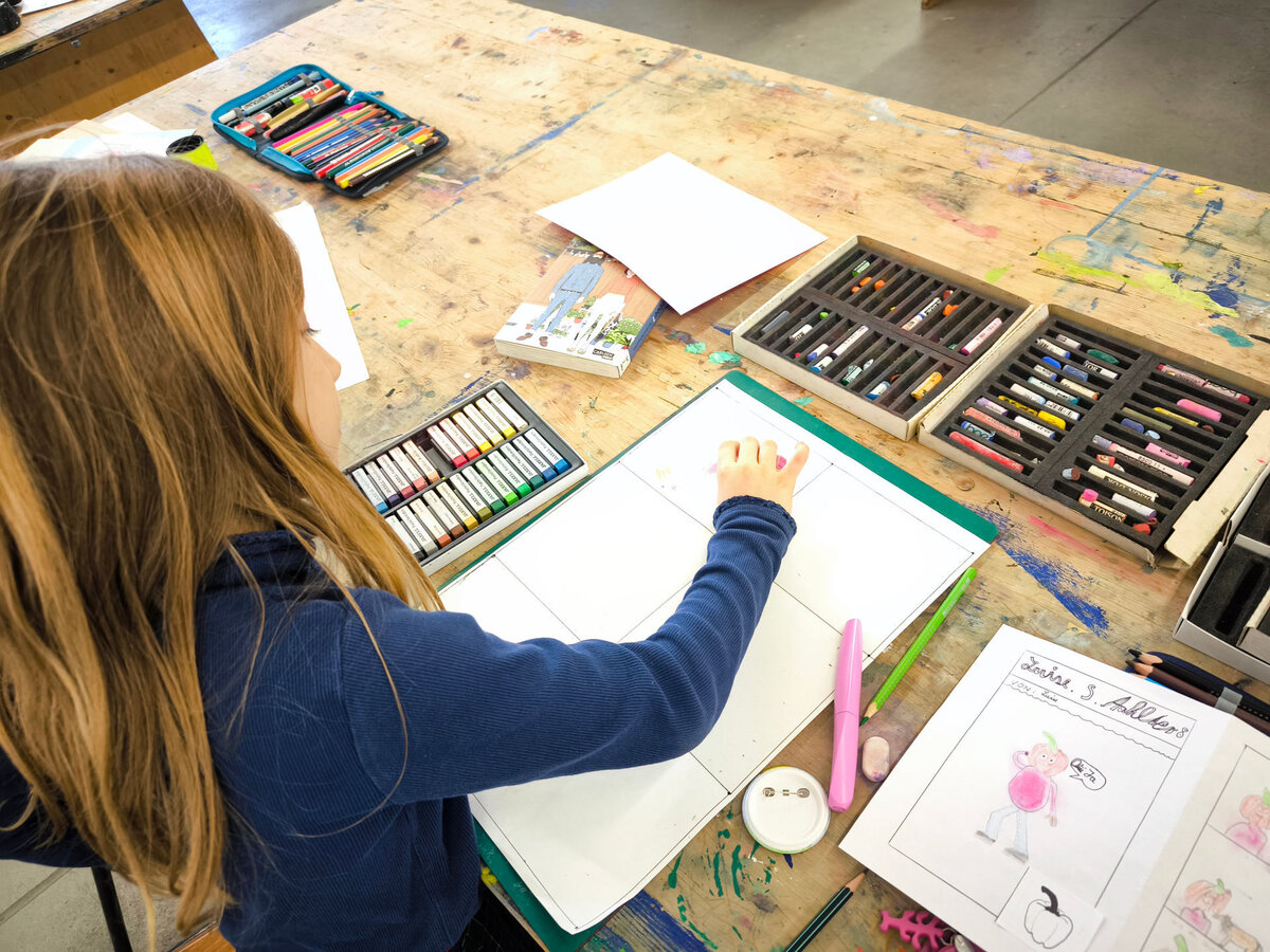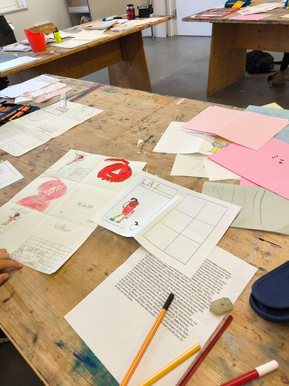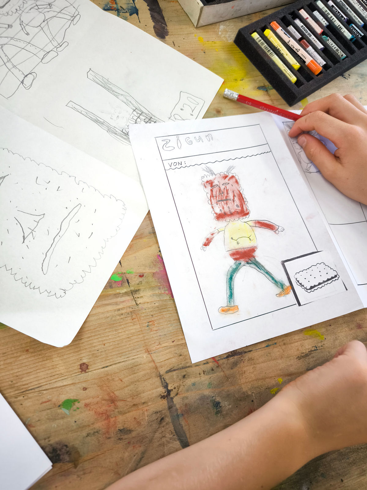 Aus der Projektbeschreibung: "Die Welt ist ein großer Supermarkt" - Gemeinsam entdecken wir Geschichten zwischen den Regalen. Hast du dich schon mal gefragt, was passieren würde, wenn du dich nach Ladenschluss in einem Supermarkt versteckst? Wusstest du, dass die Zitrone mit der Orange zusammen ist? Und warum will das Eis auf keinen Fall verkauft werden? In diesem Workshop tauchen wir ein in die fantastische Welt des Supermarkts. Gemeinsam erfinden wir Figuren, schreiben kleine Geschichten und entdecken, wie man mit Bildern erzählen kann. Vielleicht triffst du eine Sardinendose, die Model werden will – oder eine Cola, die auf der Suche nach ihrem Bruder ist! Du lernst: - Wie man Gegenständen Persönlichkeit verleiht - Wie man Geschichten mit Bildern erzählt - Wie du deine eigene Comic-Seite gestaltest Du musst nicht gut zeichnen können und brauchst keine perfekten Texte – Neugier und ein bisschen Fantasie reichen völlig aus. Mach mit und entdecke den Supermarkt von einer ganz anderen Seite.