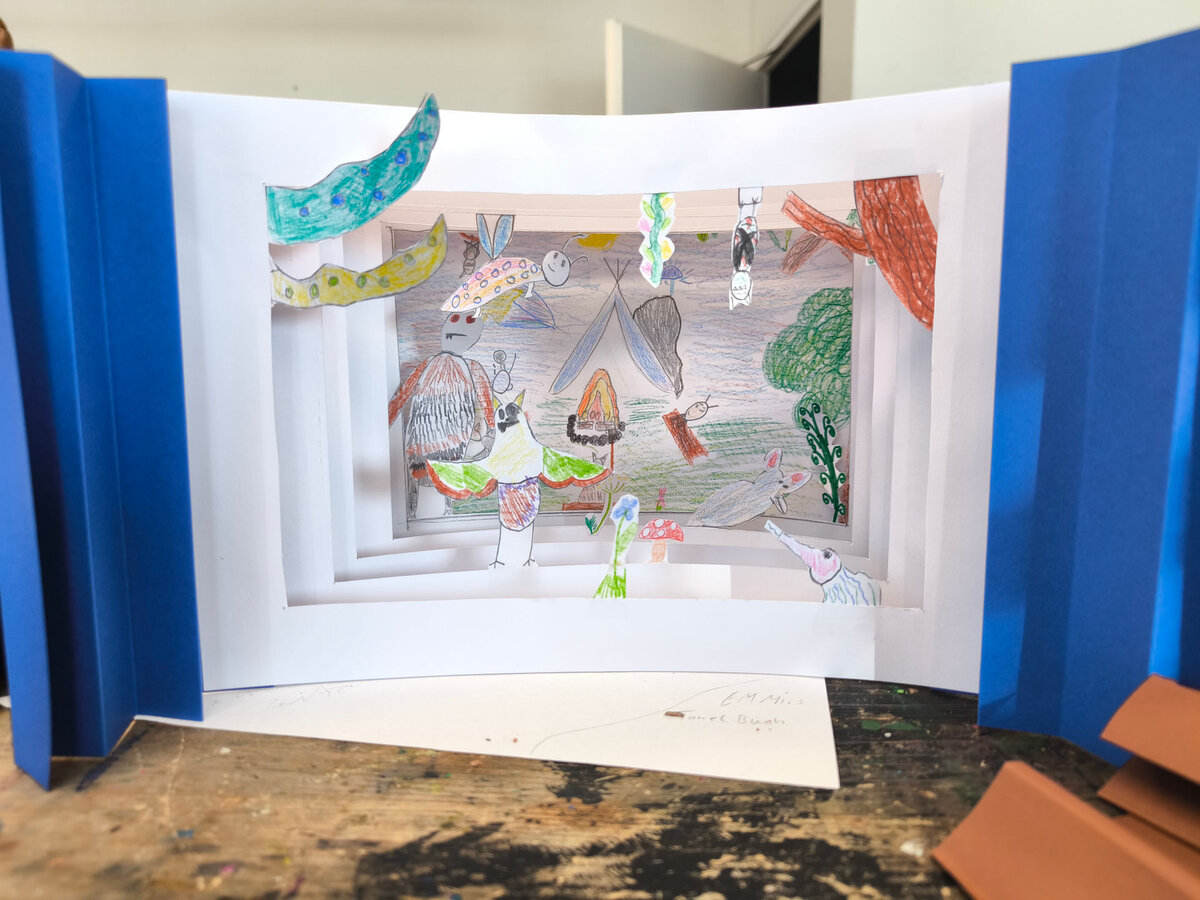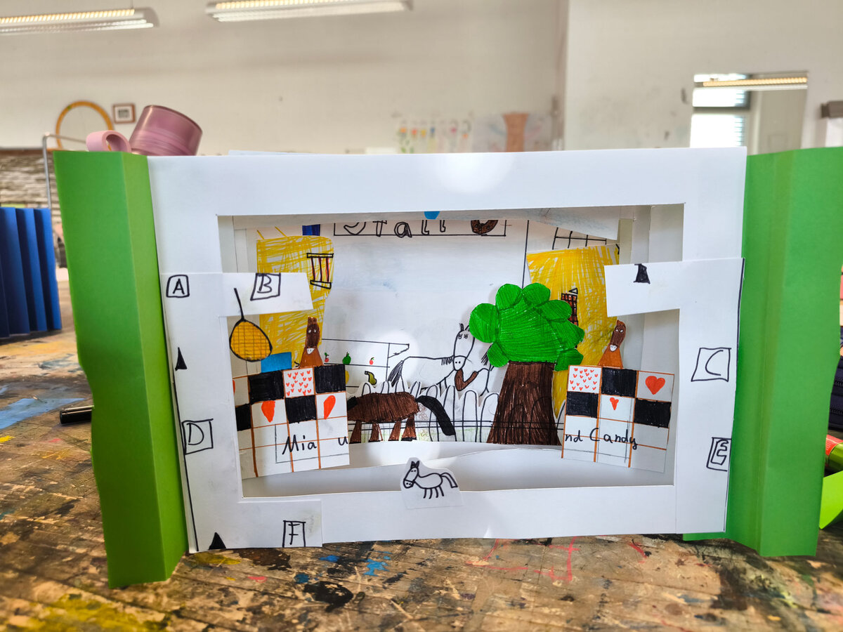 Projektbeschreibung: In der Projektwoche möchte ich mit euch ein Tunnelbuch anfertigen. Ein Tunnelbuch hat zwei Leporello-Seitenwände, zwischen die die Seiten geklebt werden. Sie lassen sich nicht umblättern, wie die Seiten eines normalen Buches. Aus jeder Seite wird ein Loch herausgeschnitten. Man schaut also vom Buchanfang bis zum Buchende durch die Seiten hindurch wie durch ein Fernrohr. Zu einer Geschichte, die wir uns gemeinsam aussuchen, einem Märchen, oder einem Gedicht werden wir Bilder entwerfen. Diese zeichnen oder malen wir auf Papier, schneiden sie aus und befestigen sie. Am Ende haben wir ein experimentelles Buch und ein Bühnenbild en Miniature.