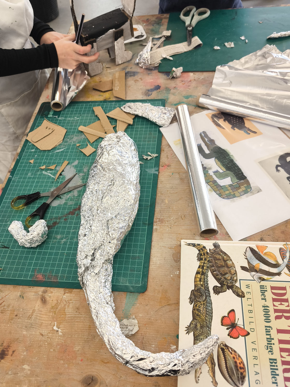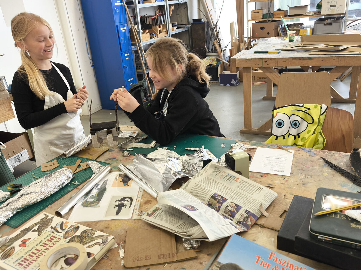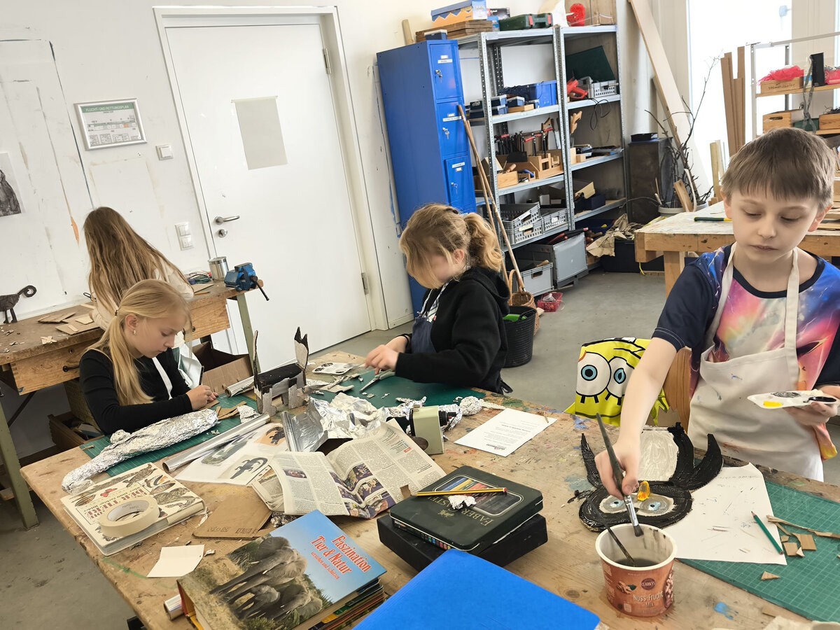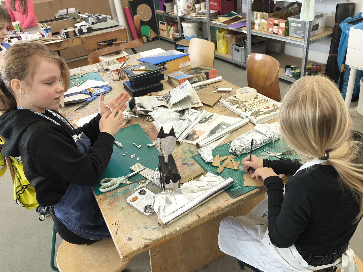 Aus der Projektbeschreibung: In der Werkstatt für Plastisches Gestalten / Objekt arbeiten wir vorrangig mit dem Material Pappe, Papier, Alufolie und Klebstoff. Aber auch Fundstücke (Naturmaterialien, Plastikmüll, Gesammeltes) werden bei den entstehenden Plastiken und Skulpturen zum Einsatz kommen. Thematisch dreht sich alles um Tiere. Gutes Beobachten ist beim Naturstudium genauso gefragt wie der Mut und die Phantasie beim Verfremden und Experimentieren. BITTE EIN ALTES SHIRT /SCHÜRZE ZUM SCHUTZ DER KLEIDUNG MITBRINGEN!!!