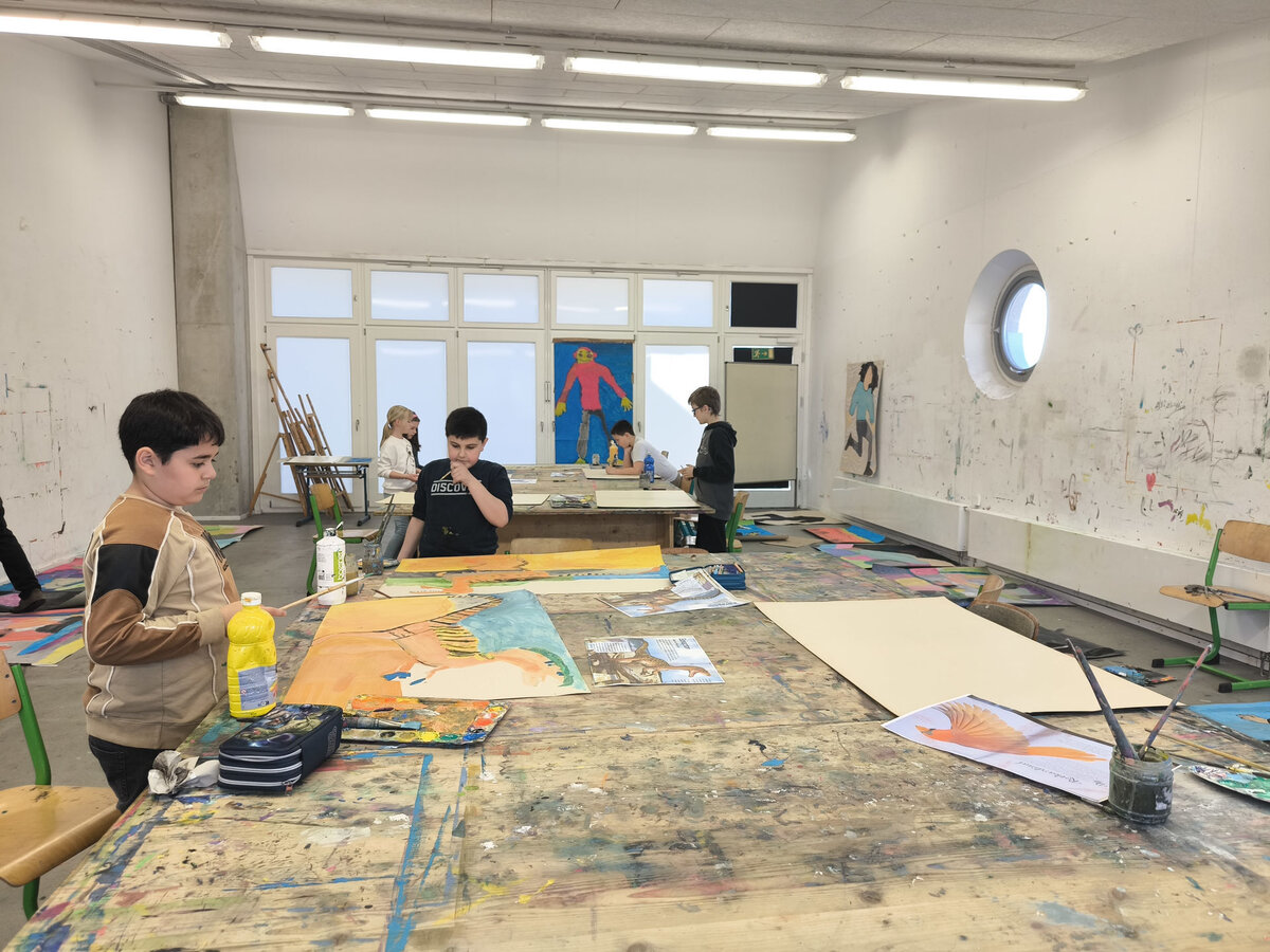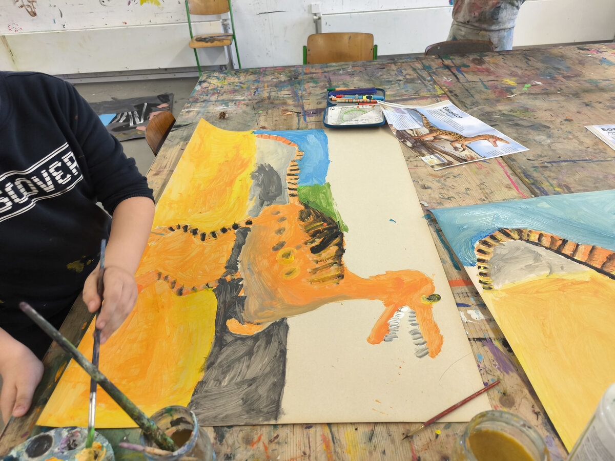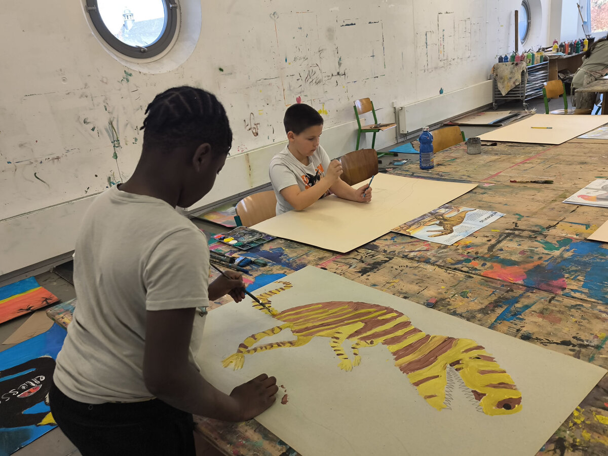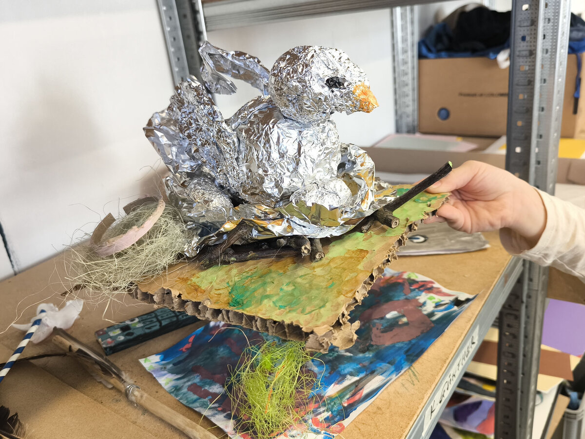 Aus der Projektbeschreibung: In der Werkstatt für Plastisches Gestalten / Objekt arbeiten wir vorrangig mit dem Material Pappe, Papier, Alufolie und Klebstoff. Aber auch Fundstücke (Naturmaterialien, Plastikmüll, Gesammeltes) werden bei den entstehenden Plastiken und Skulpturen zum Einsatz kommen. Thematisch dreht sich alles um Tiere. Gutes Beobachten ist beim Naturstudium genauso gefragt wie der Mut und die Phantasie beim Verfremden und Experimentieren. BITTE EIN ALTES SHIRT /SCHÜRZE ZUM SCHUTZ DER KLEIDUNG MITBRINGEN!!!