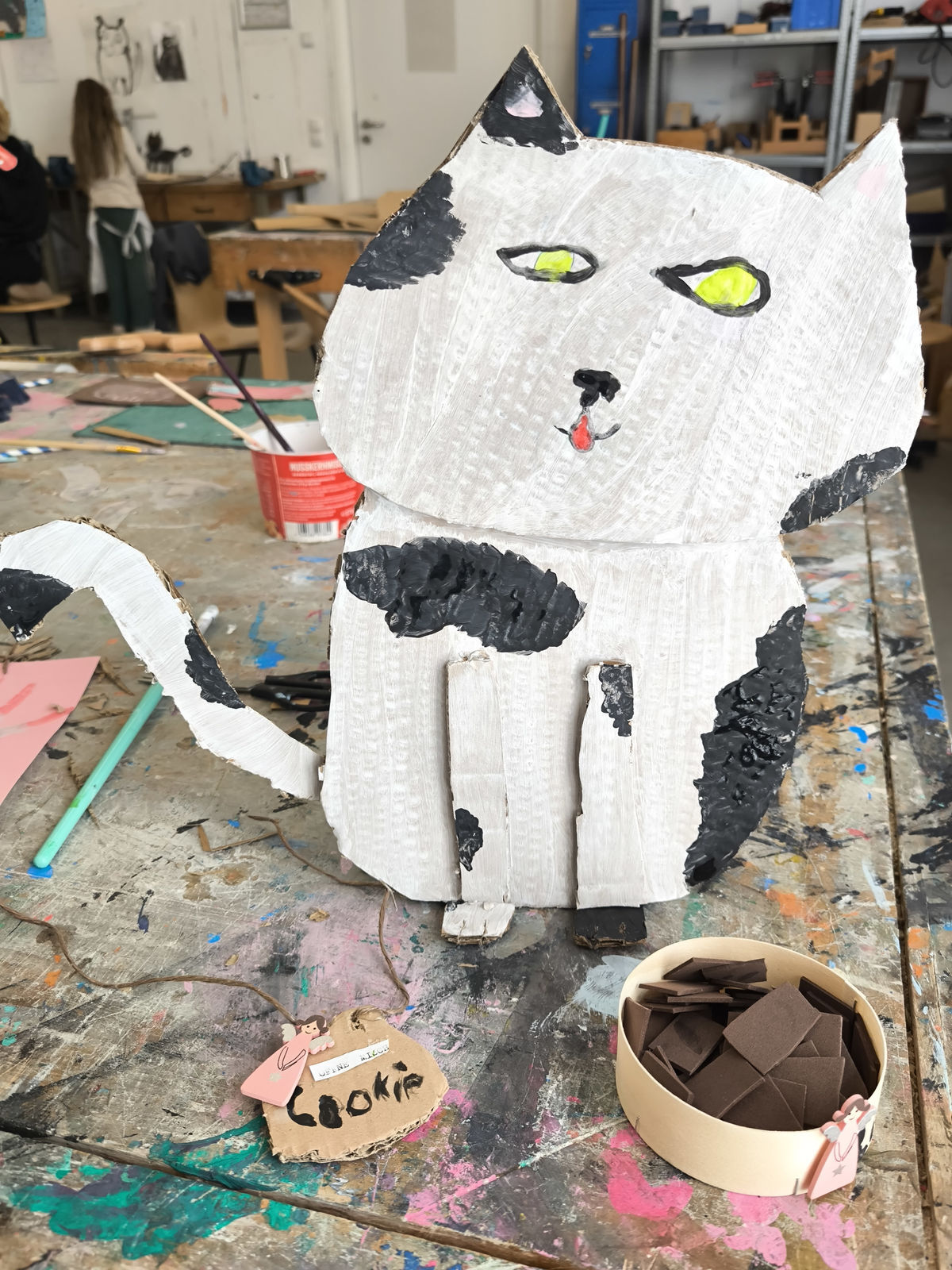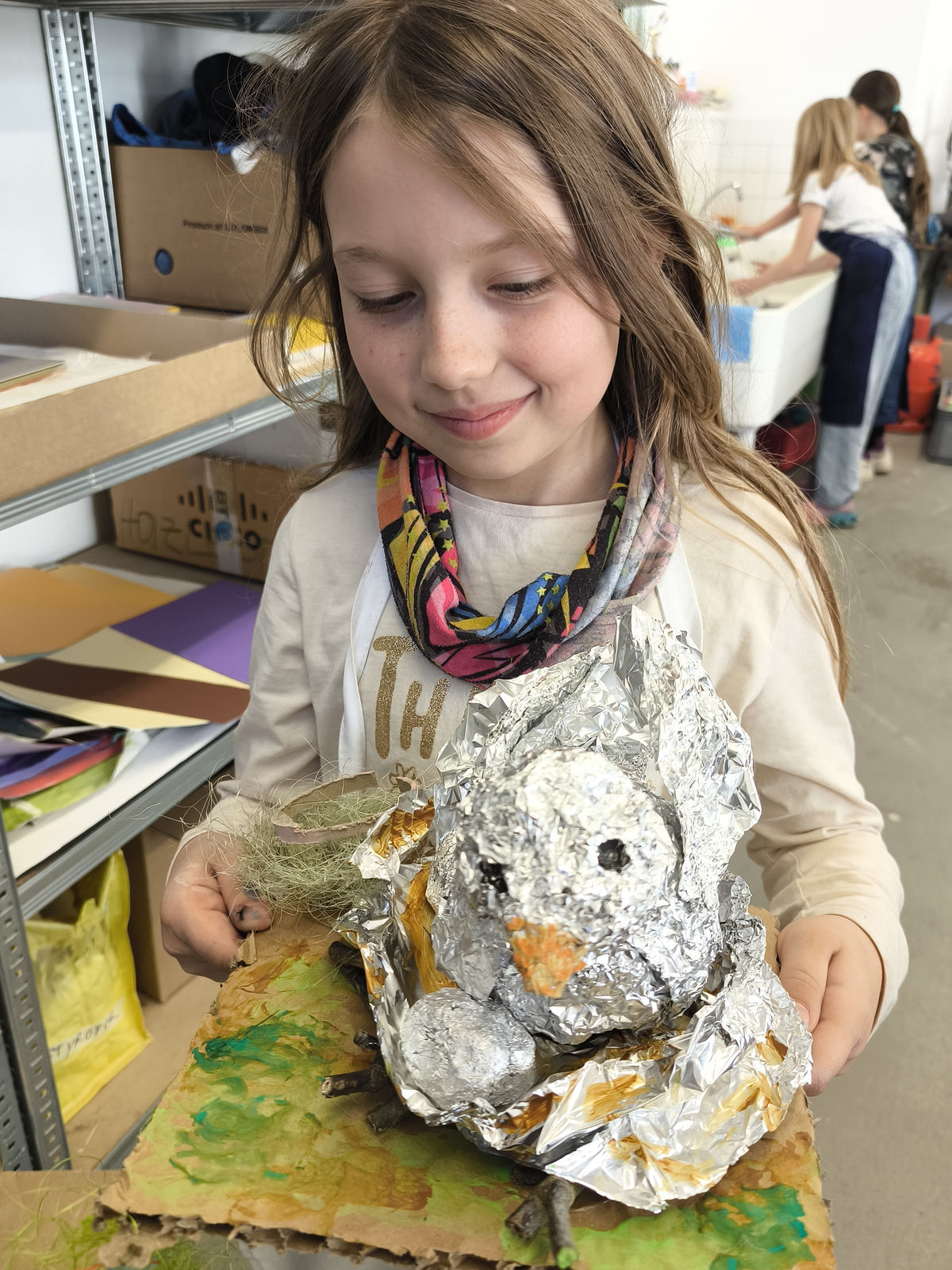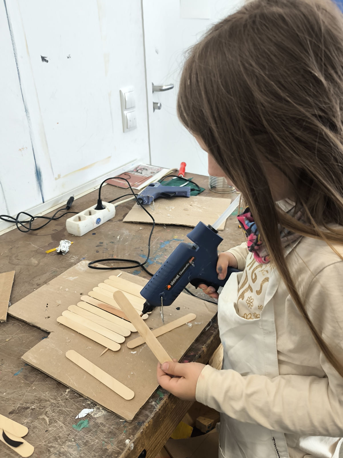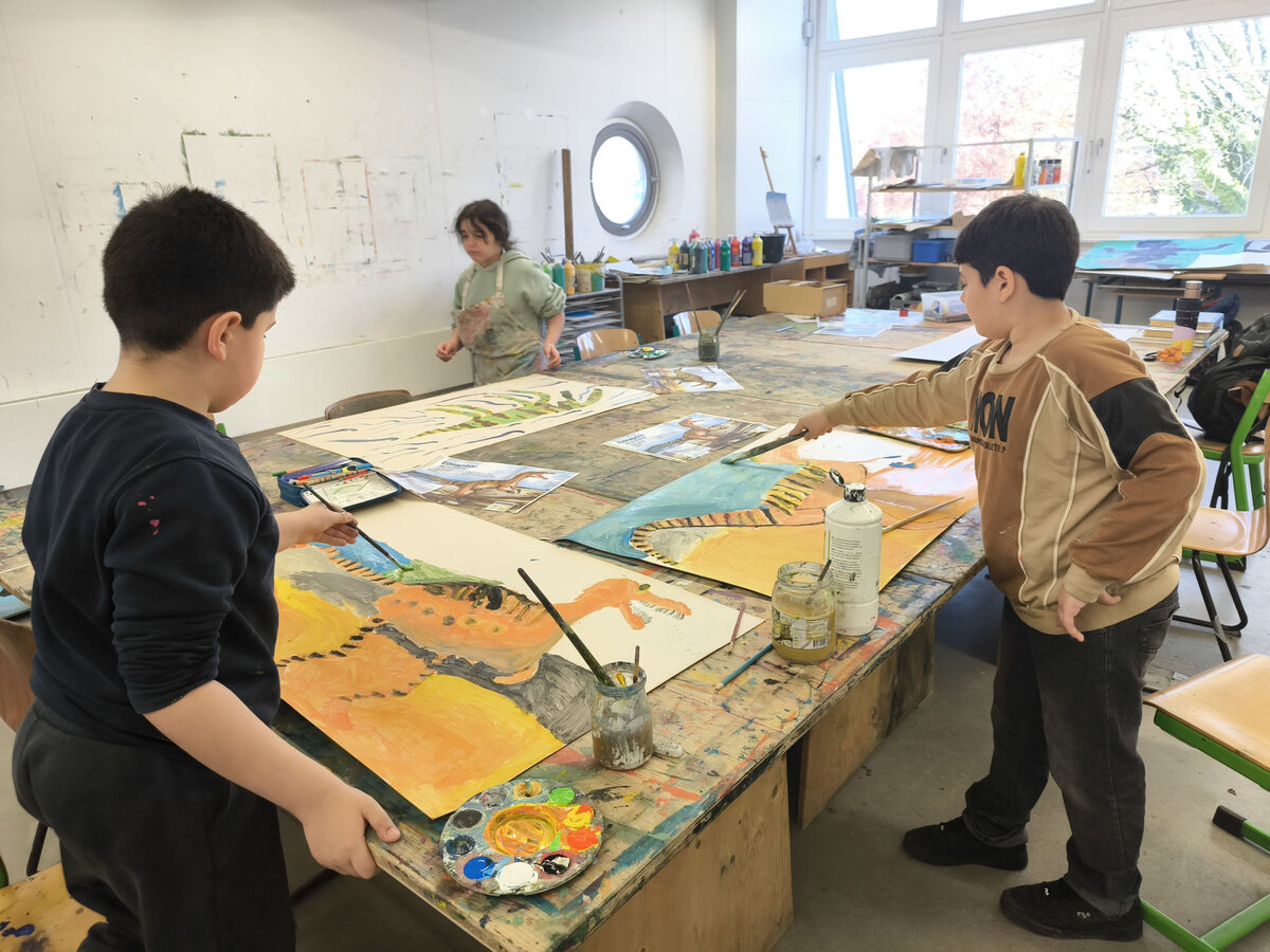 Aus der Projektbeschreibung: In der Werkstatt für Plastisches Gestalten / Objekt arbeiten wir vorrangig mit dem Material Pappe, Papier, Alufolie und Klebstoff. Aber auch Fundstücke (Naturmaterialien, Plastikmüll, Gesammeltes) werden bei den entstehenden Plastiken und Skulpturen zum Einsatz kommen. Thematisch dreht sich alles um Tiere. Gutes Beobachten ist beim Naturstudium genauso gefragt wie der Mut und die Phantasie beim Verfremden und Experimentieren. BITTE EIN ALTES SHIRT /SCHÜRZE ZUM SCHUTZ DER KLEIDUNG MITBRINGEN!!!